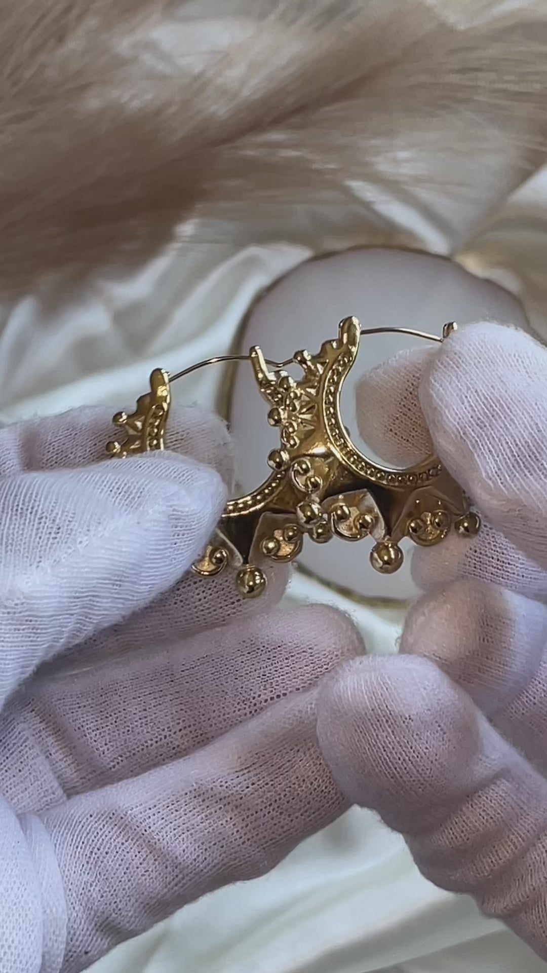 Traditional gold crown creole hoops, crafted from 9ct gold vermeil, ensuring they are tarnish-resistant, long lasting and chip-free.